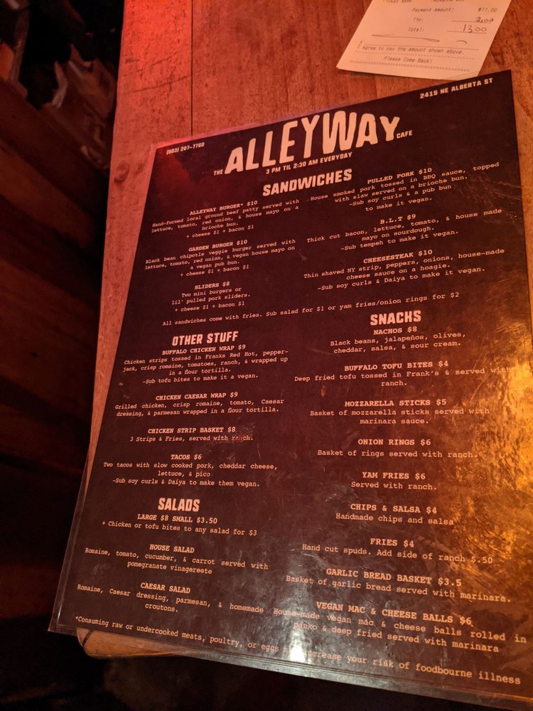 Alleyway Cafe & Bar, located in Portland, OR, offers a unique blend of New American cuisine in a divey, hipster atmosphere. With a range of utilities including outdoor seating, live music, and a full bar, this spot is perfect for groups looking for a fun night out. The menu features vegan and vegetarian options, with standout dishes like hot weather hoagies with vegan cheese and artesian veggie burgers with house-cured bacon. Customers praise the friendly staff, strong drinks, and diverse drink selection. The outdoor patio area is a highlight, although some mention concerns about cigarette smoke. Overall, Alleyway Cafe & Bar provides a low-key, no-frills experience for those looking to enjoy great food and drinks in a laid-back setting.